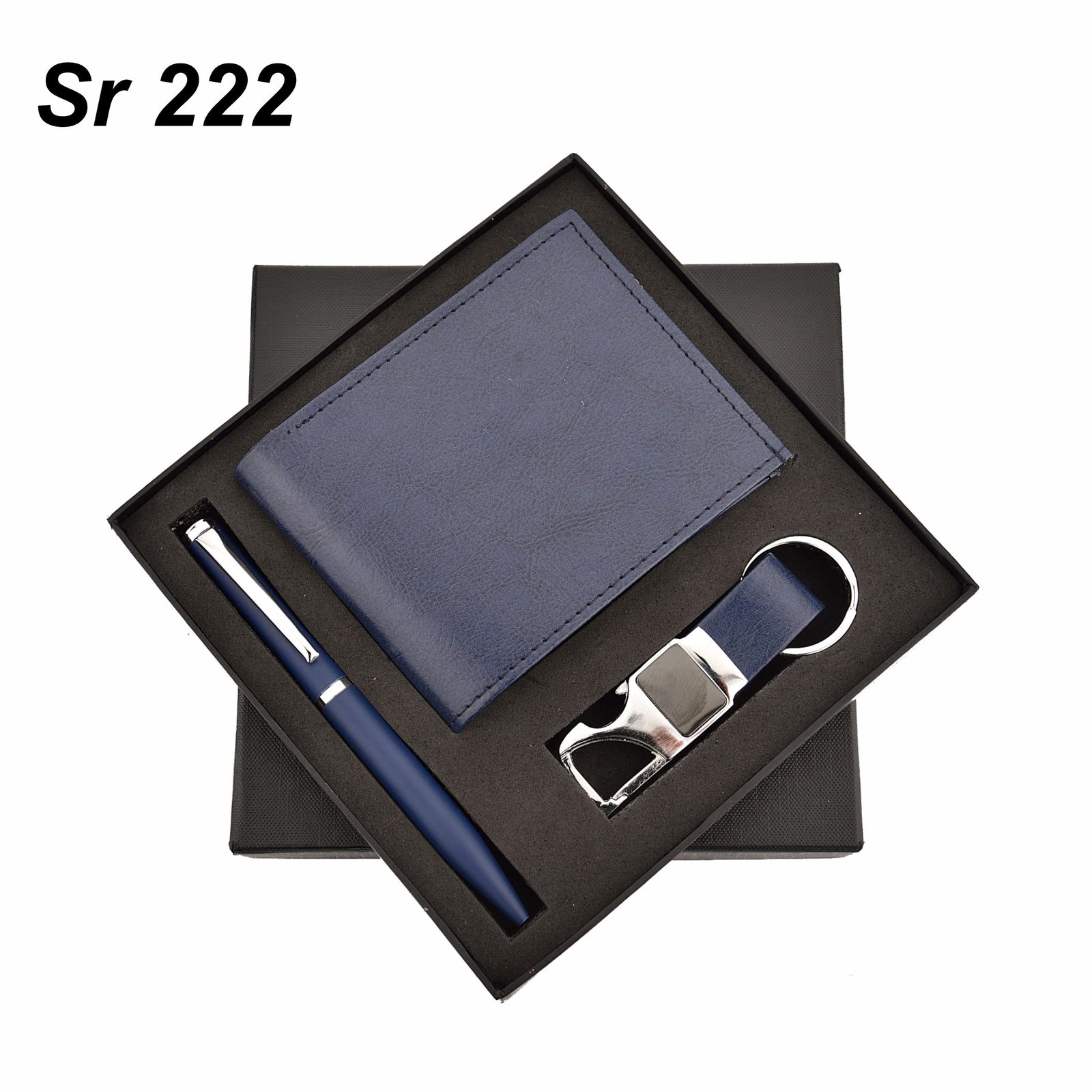 This 3 in 1 Wallet Set comes with a Metal Pen, Keychain & Wallet in Blue colour.