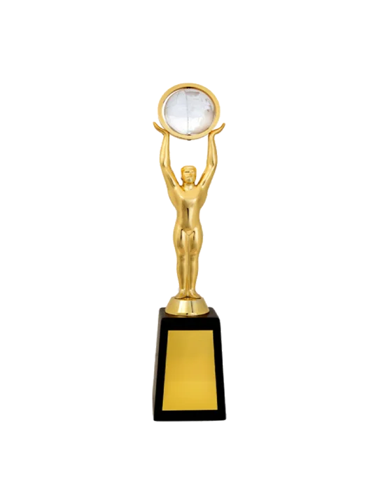 Be the change! The Man spreading arms and holding the crystal sphere on the top picturizes the world. The whole sign is supported by wooden and gold base which can be utilized for branding artwork.