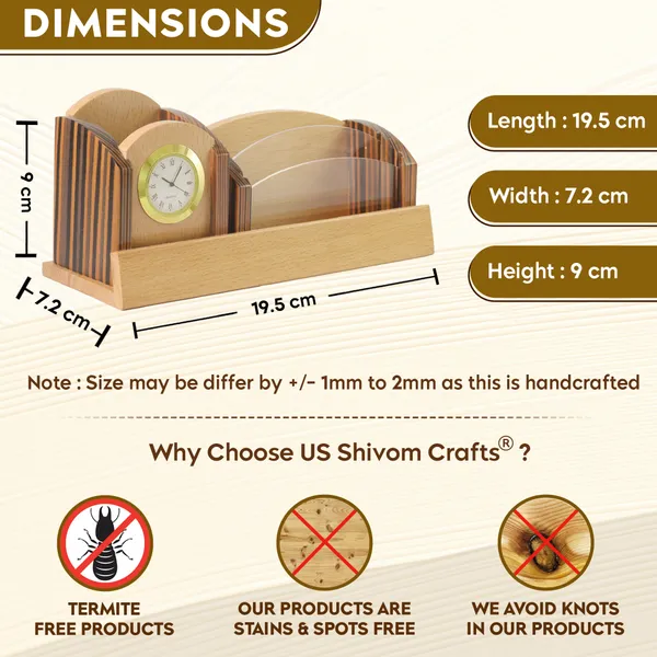 This Personalised Beige Wooden Desk Organiser with Name Plate, Mobile stand, Pen Stand, Clock and visiting Card Holder comes with Compartments For Storing Pens, Pencils, Markers, And Other Office Supplies. The Wooden Material Used In The Construction Of The Stand Gives It A Natural And Elegant Look That Complements a Variety of Decor Styles.