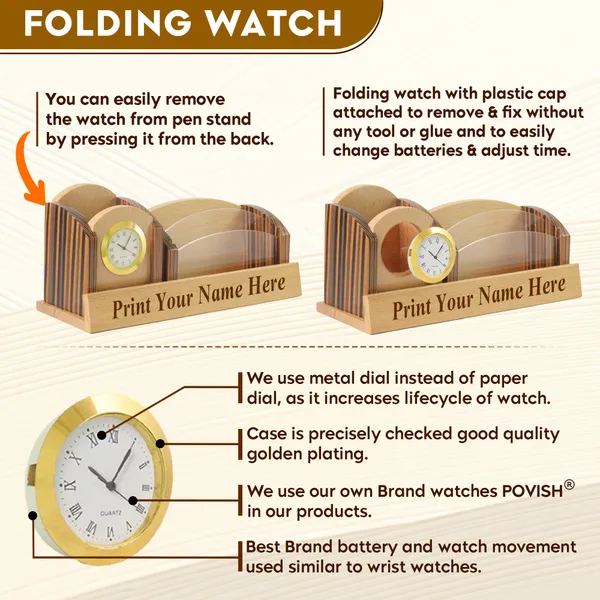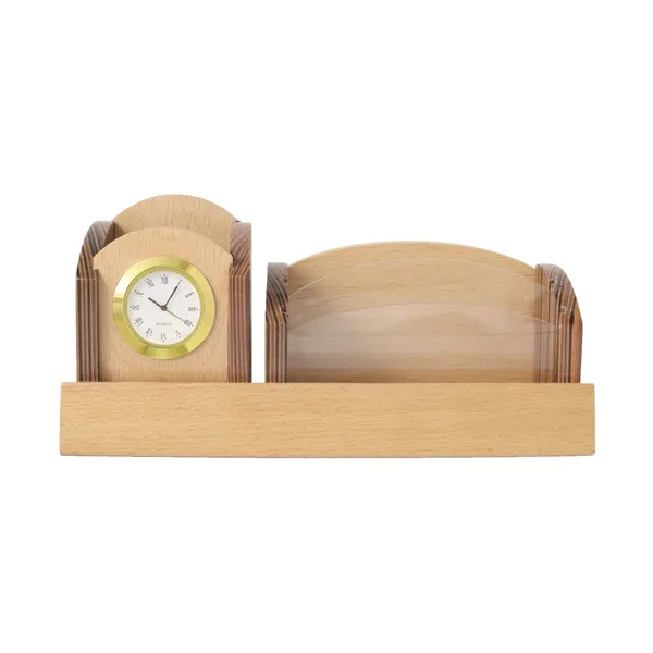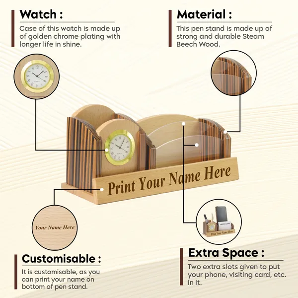 Beige Wooden Pen Stand with Personalised Name with Clock and Mobile Stand and card Holder