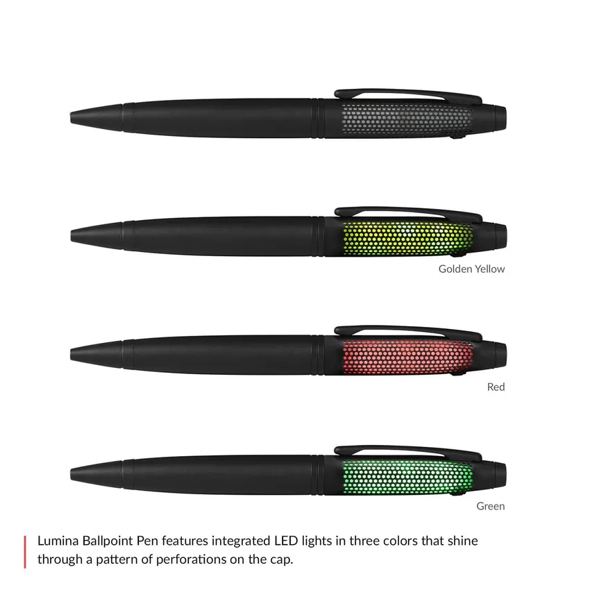 The Lumina Ballpoint Pen Features Integrated LED Lights In Three Colours That Shine Through A Pattern Of Perforations On The Cap. Change The Colour To Match Your Mood With A Quick Click Of The Button At The Back Of The Pen. This Fine Writing Instrument Requires Two Button Cell Batteries Which Are Included In The Packaging. The Item Is Presented In A Premium Gift Box Along With A User Guide.
