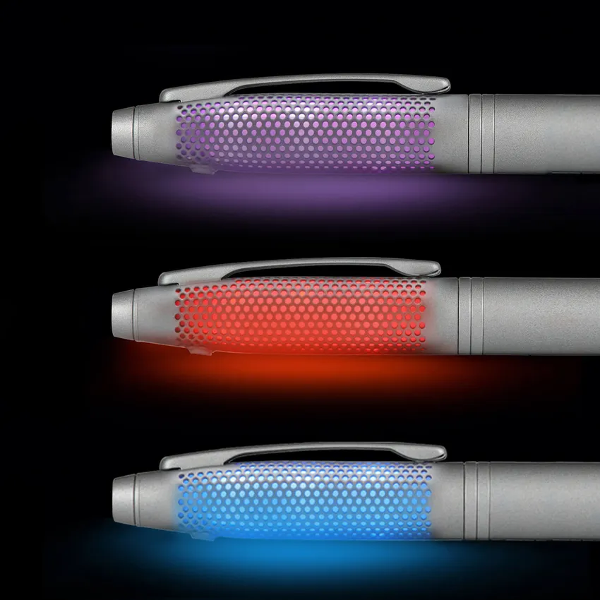The Lumina Ballpoint Pen Features Integrated LED Lights In Three Colours That Shine Through A Pattern Of Perforations On The Cap. Change The Colour To Match Your Mood With A Quick Click Of The Button At The Back Of The Pen. This Fine Writing Instrument Requires Two Button Cell Batteries Which Are Included In The Packaging. The Item Is Presented In A Premium Gift Box Along With A User Guide.