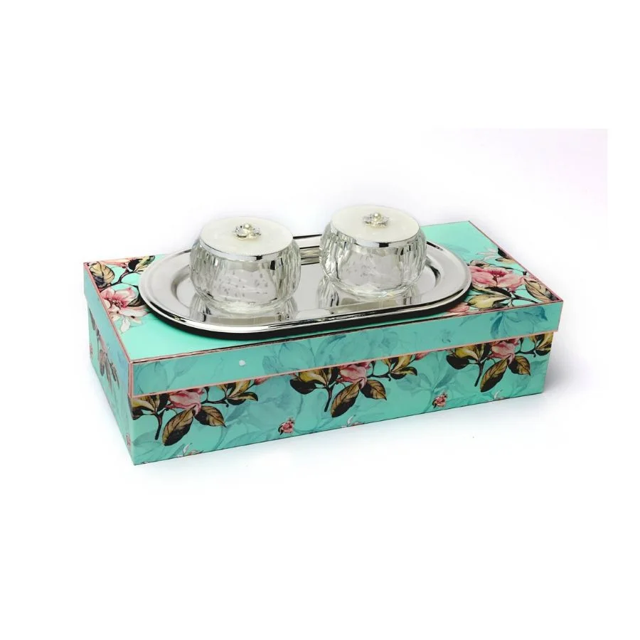 Beautifully crafted Crystal Bowls With Oval Silver Tray is a perfect gift and looks lovely when packed with eatables or dry-fruits. It will look great on the table as a centerpiece or serving special food on special events. It is crafted with utter precision and high-quality material. The shine of the tray and bowls will remain the same for the lifetime because it is lacquered. You can use it as a serving tray, fill it with handmade chocolates, dry fruits, etc will look festal when placed on the occasional buffet. It can be gifted like that as a gift hamper too.