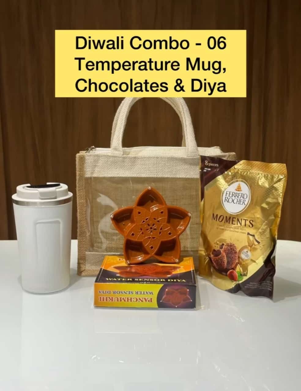 This Diwali combo 05 Gift set comes with a Temperature Coffee Mug, with Chocolates a Diya and a Jute Bag.