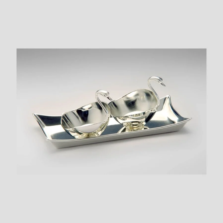 Finely crafted Silver Duck Bowl Tray Set is a perfect gift and looks lovely when packed with eatables or dry-fruits. It will look great on the table as a centerpiece or serving special food on special events. It is crafted with utter precision and high-quality material. The shine of the tray and bowls will remain the same for the lifetime because it is lacquered. You can use it as a serving tray, fill it with handmade chocolates, dry fruits, etc will look festal when placed on the occasional buffet. It can be gifted like that as a gift hamper too.