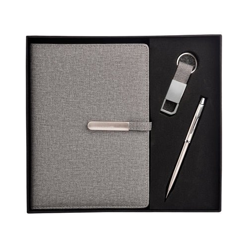 Introducing our Set of 3 Gift Sets, the epitome of style and utility. Each set combines a finely crafted pen, an elegant diary, and a stylish keychain to enhance your everyday essentials. Whether for gifting or personal use, these ensembles are designed to elevate your daily routine. Presented in an elegant gift box, they make a statement of sophistication and practicality. Elevate your essentials with our versatile gift sets.