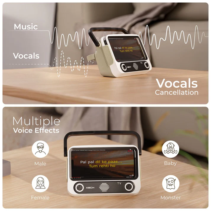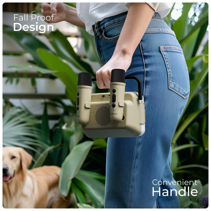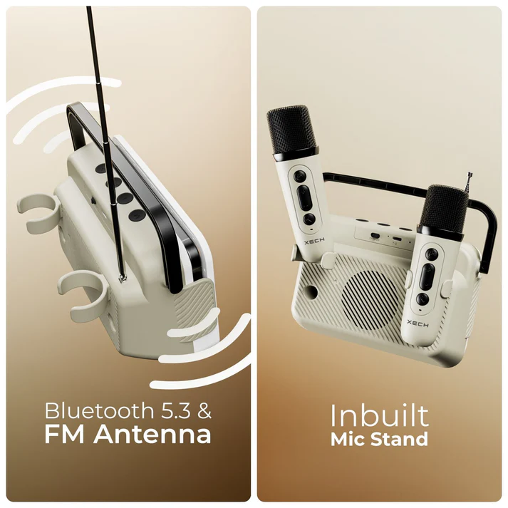 Bluetooth Karaoke System with Dual Mics and Phone Holder :- Enjoy hassle-free karaoke at home with dual wireless mics, vocal cancellation, and a smartphone holder for duet singing without interruptions.