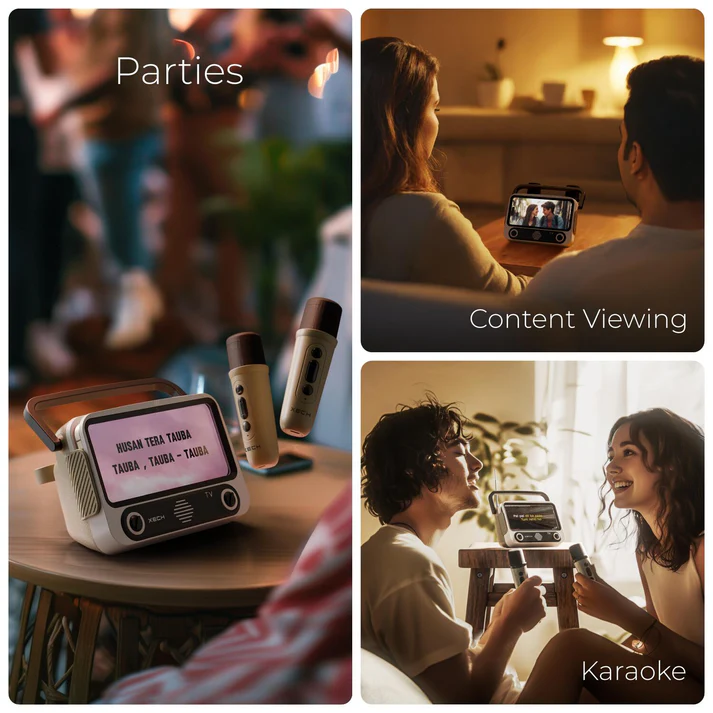 Sing Your Heart Out with Duet Mode :- Wireless dual microphones make duets seamless and fun, perfect for family or party nights.