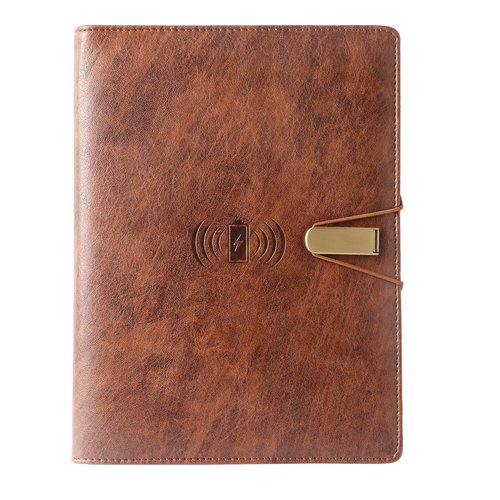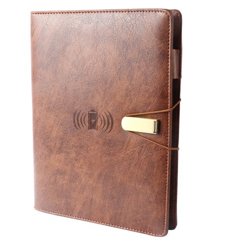 - A-5 Size Powerbank Notebook Folder with Brown Soft Pu Cover and 8000 mAh Capacity