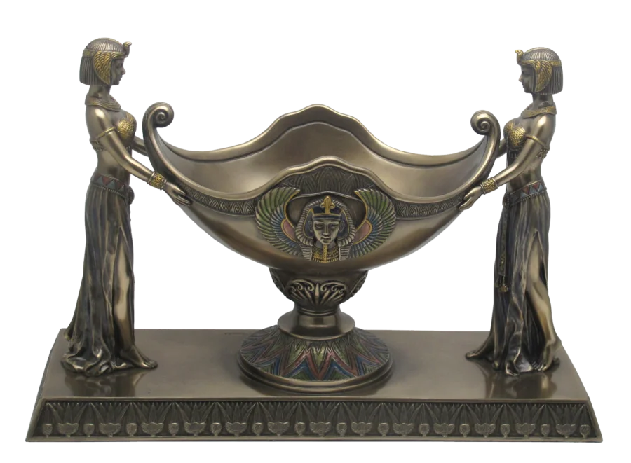 The deco sculpture art of this Maidens Coupe Egyptian Centerpieces has rich tones of bronze and subtle colors on decorative accents. It characterizes two Egyptian maidens dressed in lavish traditional costumes come together atop a detailed base holding a coupe. Excellent pick to make a bold statement, this centerpiece impresses with a mysterious flair. This display-quality indoor sculpture transforms entertainment area or recreation room into something truly magnificent! Employ the ancient Egyptian symbol of protection, royal power, and good health with this amazing sculpture. These perfect Egyptian Centerpieces are the home decor items anyone would love to have.
