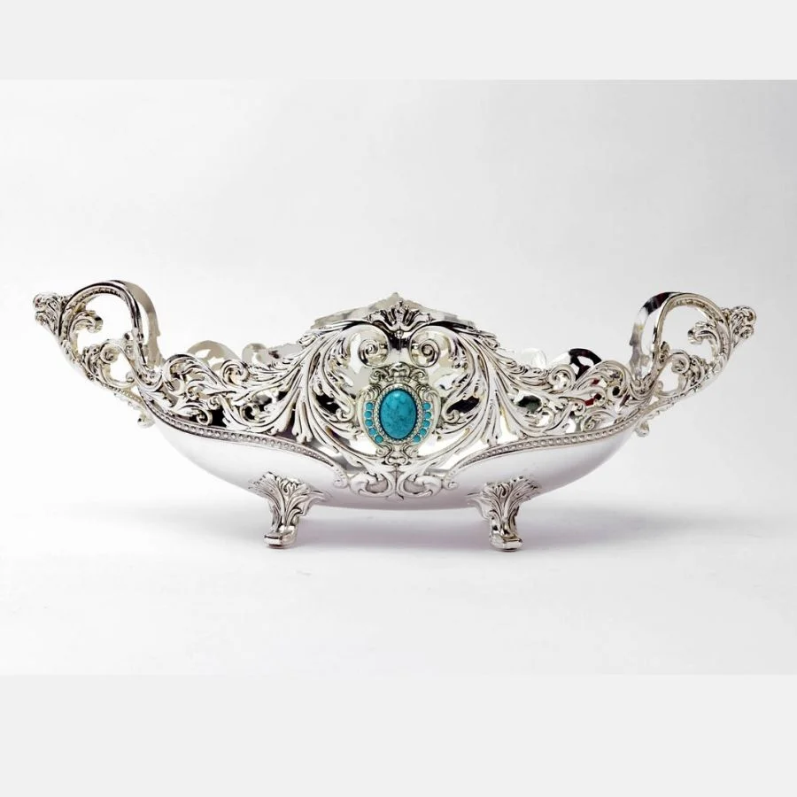 This bowl (Size- Big) is a classic amalgamation of elegance and antiquity. It is certain to be an attention seeker with a blue stone at the centre that accentuates its overall look. It is an exquisite centerpiece that comes packed with intricate detailing that gives an antique feeling. It helps to stylishly present fruits, chocolates, eatables, wine bottles, etc. Fill this silver-plated bowl with handmade chocolates, dry fruits etc will look festal when placed on the occasional buffet. It can be gifted like that as a gift hamper too. This Bowl is sure to get the receiver praise your choice of gift. The fine craftsmanship is evident in this bowl.