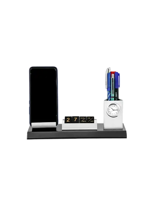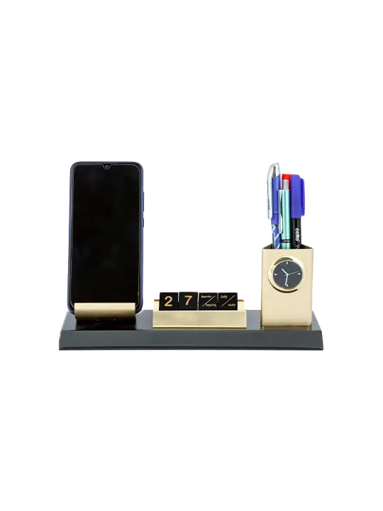 Have you wanted to give your desk an elegant look? Then what are you waiting for, here is the elegant desk organizer we have for you. This wooden based desk holder is holding the simple and sober mobile stand with cube style calendar and clock in pen stand. This is available in two variant colors like silver and gold.