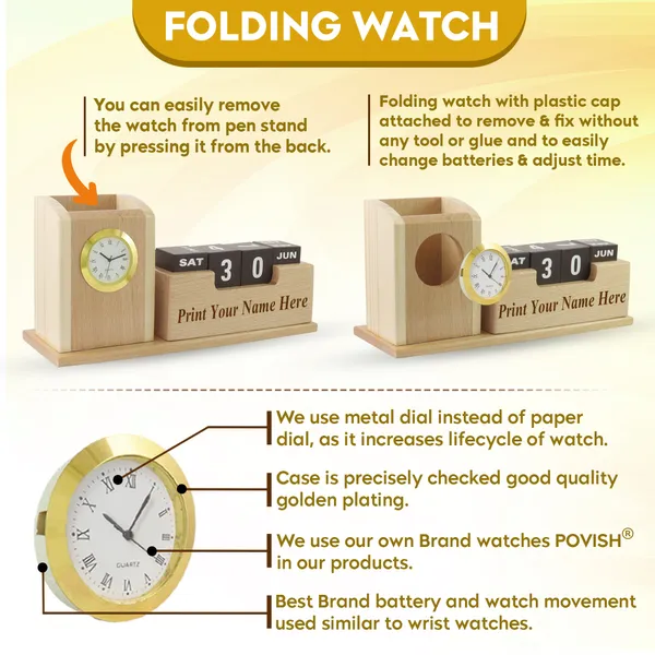 This Wooden Desk Organizer comes with 2 Compartments a Pen Holder, Mobile Phone Holder, Clock And Endless Calendar For Home and Office – Customized, Personalized Gift, Get Your Name Printed