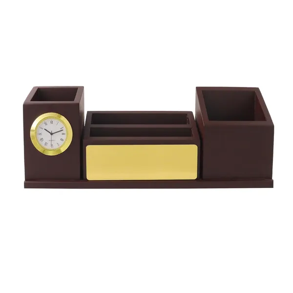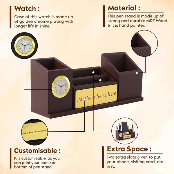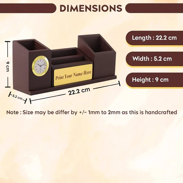 The Wooden Pen Stands With Clock, Mobile, And Visiting Card Holder Is A Stylish And Functional Accessory That Adds A Touch Of Elegance To Any Desk Or Workspace. Its Multiple Compartments Make It Easy to Organize Your Essential Items, While Its Compact Design Ensures It Can Fit Easily On Any Desk Or Tabletop. Whether You are At Home, In The Office, Or In A Classroom, This Pen Stand Is An Essential Accessory That Can Help You Stay Organized And Focused On Your Work.