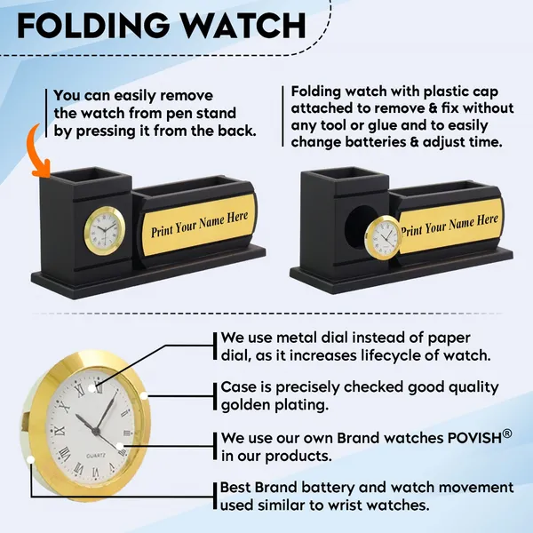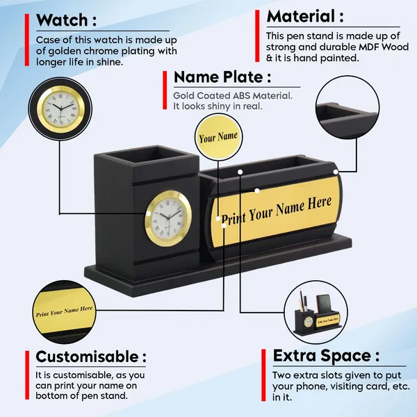 Overall, The Wooden Pen Stands With Clock, Mobile, And Visiting Card Holder is a Stylish And Functional Accessory That Adds A Touch Of Elegance To Any Desk Or Workspace. Its Multiple Compartments