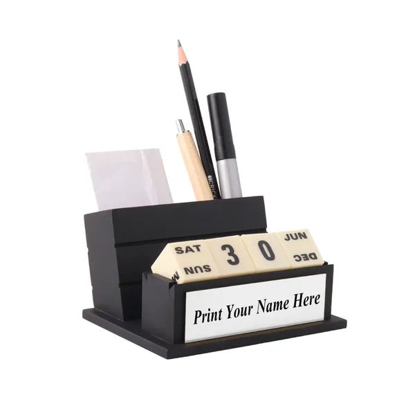 Personalised Matt Black Wooden Desk Organiser with Name Plate, Calendar, Card/Mobile Stand (Silver)