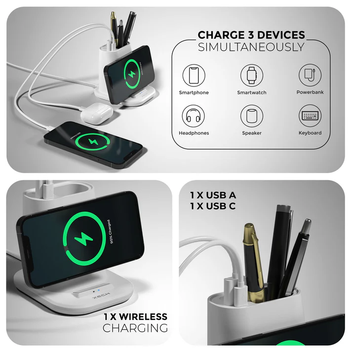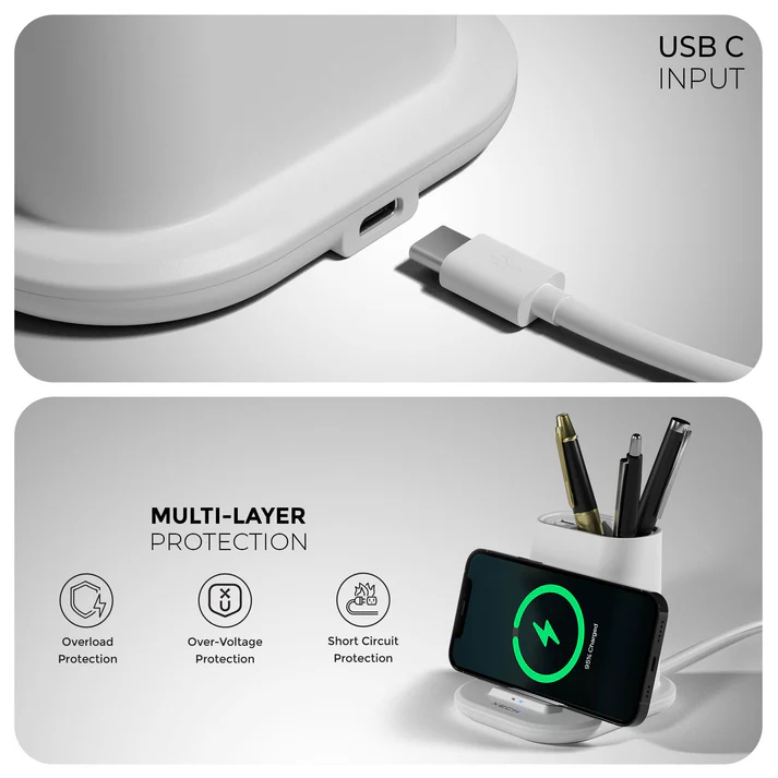 Quest is a multifunctional pen stand with a wireless charger. Stay organized while you effortlessly charge your smartphone. Simply dock your phone on the Quest pen stand for easy and efficient wireless charging. Charge multiple devices simultaneously with the convenient USB C and USB A ports, compatible with various smartphones, tablets, and accessories, like headphones, Power banks, Ear pods & more! Declutter your desk with the integrated pen stand, providing a dedicated space for your writing essentials. Perfect for home, office, or on-the-go.