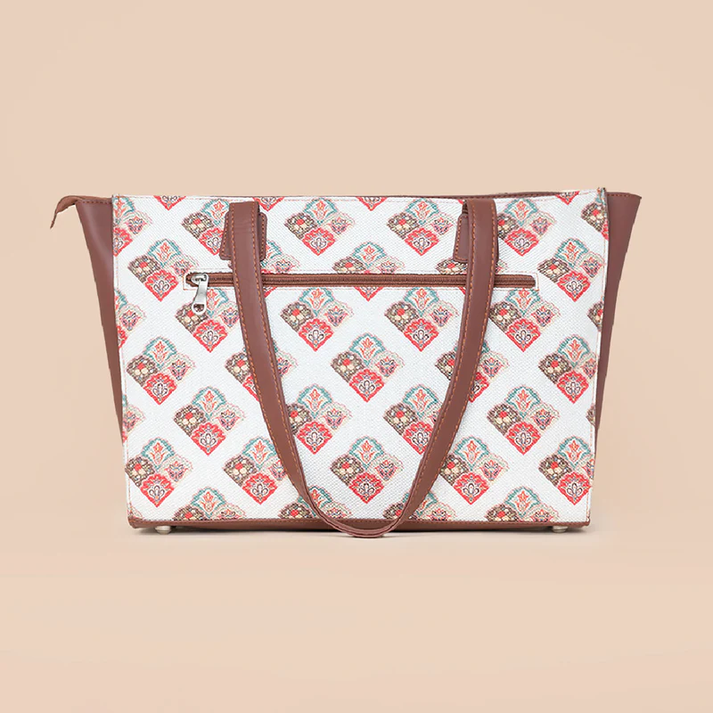 Material Used – Vegan Leather, Handicraft Fabric, Water-resistant inner lining, matte metal fittings.