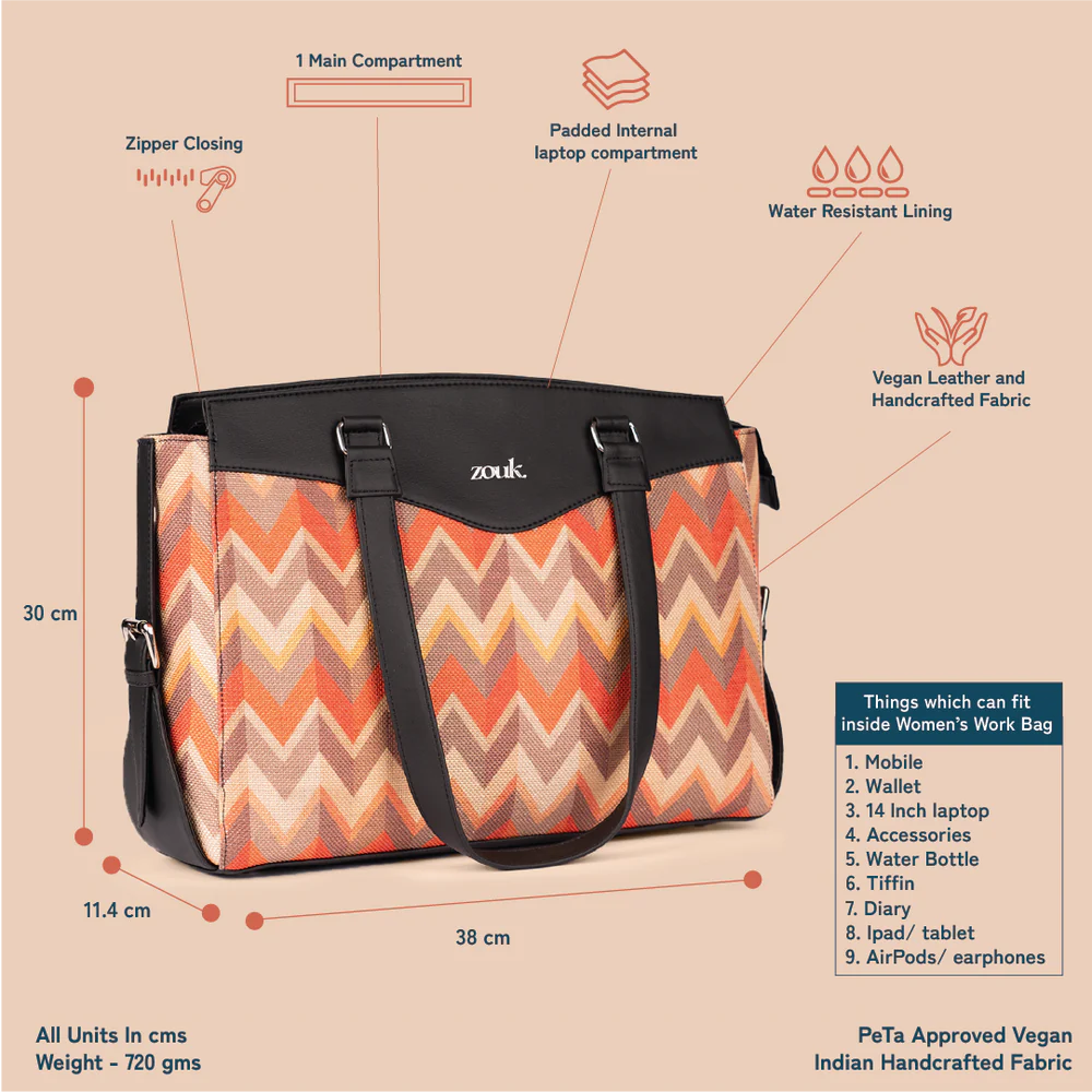 This is a Proudly Indian and 100% PETA approved Women’s Work Bag, It is the perfect blend of style, functionality, and modernism. Crafted with love and care, it combines the beauty of our jute khadi fabric with the durability of vegan leather.This bag features a spacious main compartment, which keeps your work essentials organized and within easy reach. Inside, you’ll find: