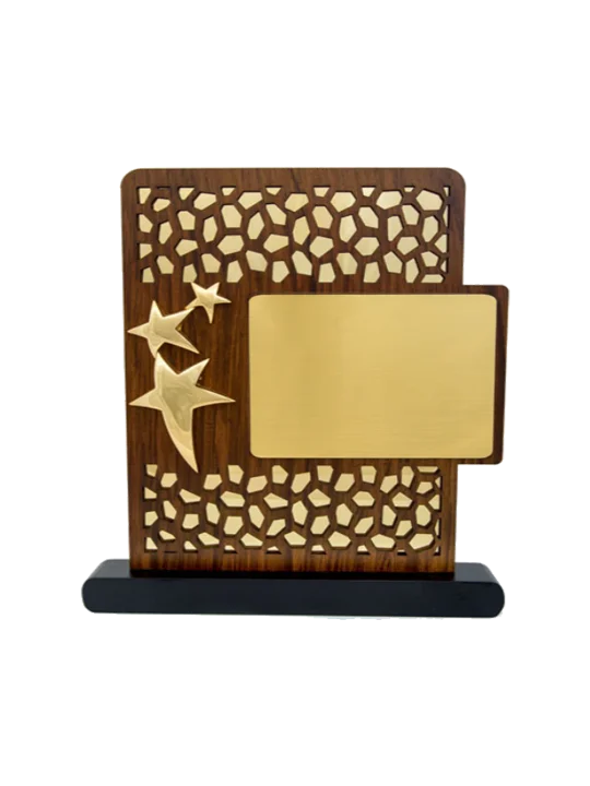 Rare like uncut diamonds! The uncut design on the wooden based memento with stars studded at the sides looks eye-catching. The rectangular gold spacing option is to remind the personality of their achievements.