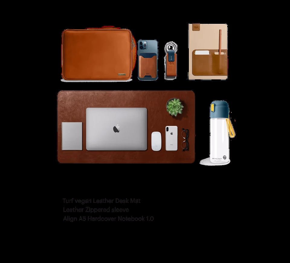 Package contents: 1 x Align A5 Hardcover Notebook 1.0, 1 x Zippered Sleeve For Laptop/MacBook, 1 x Turf Vegan Leather Desk Mat, 1 x KIYO Active Bottle, 1 x Card safe Phone Wallet, 1 x Trooper Keyring