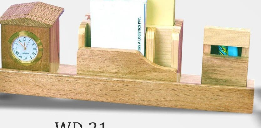 This Wooden Desktop come with a Pen Stand, a Table Clock, and Mobile or writing pad stand.