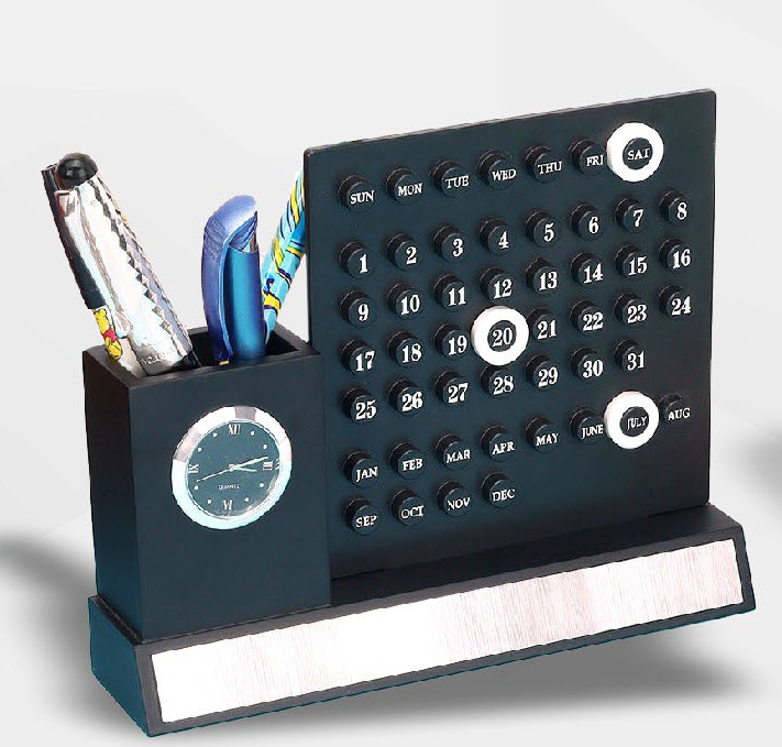 This Wooden Desktop comes with a Pen Stand a Clock and a Lifetime Calendar